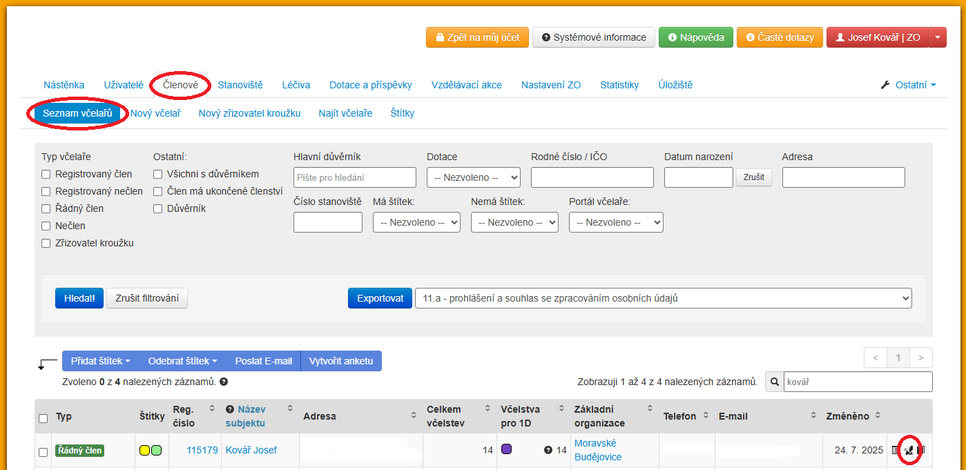 Na záložce "Členové" se otevře "Seznam členů" na řádku se jménem včelaře vpravo je ikona včely. Pokud na ni kliknete