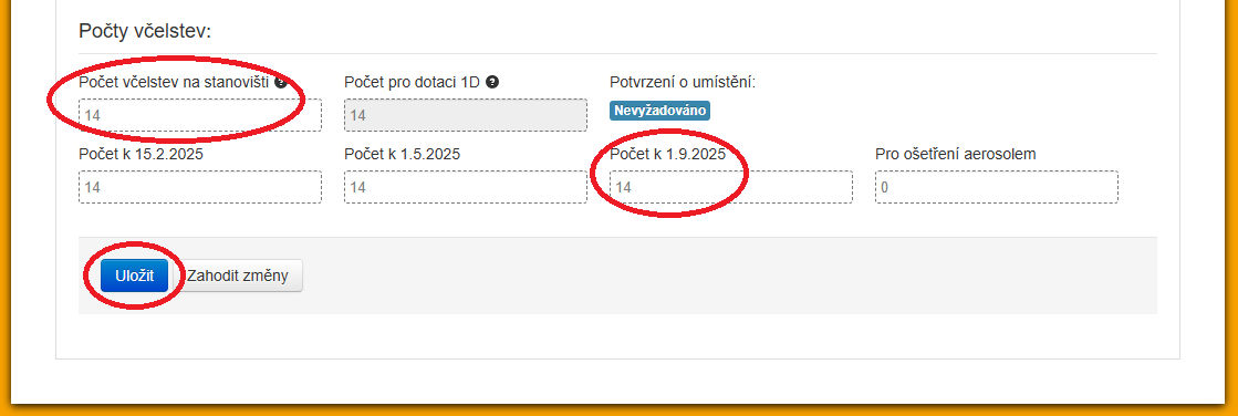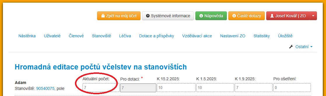 Pro správné vygenerování výše členských příspěvků je důležité mít u včelařů doplněn aktuální počet včelstev v kolonce "Počet včelstev na stanovišti" na "Kartě stanoviště" a to podle hlášení k 1.9. Odtud se berou počty včelstev pro vygenerování správné výše členského příspěvku za včelstva. Je možné, že jste již při zpracování dotací doplnili i "Počet včelstev na stanovišti".