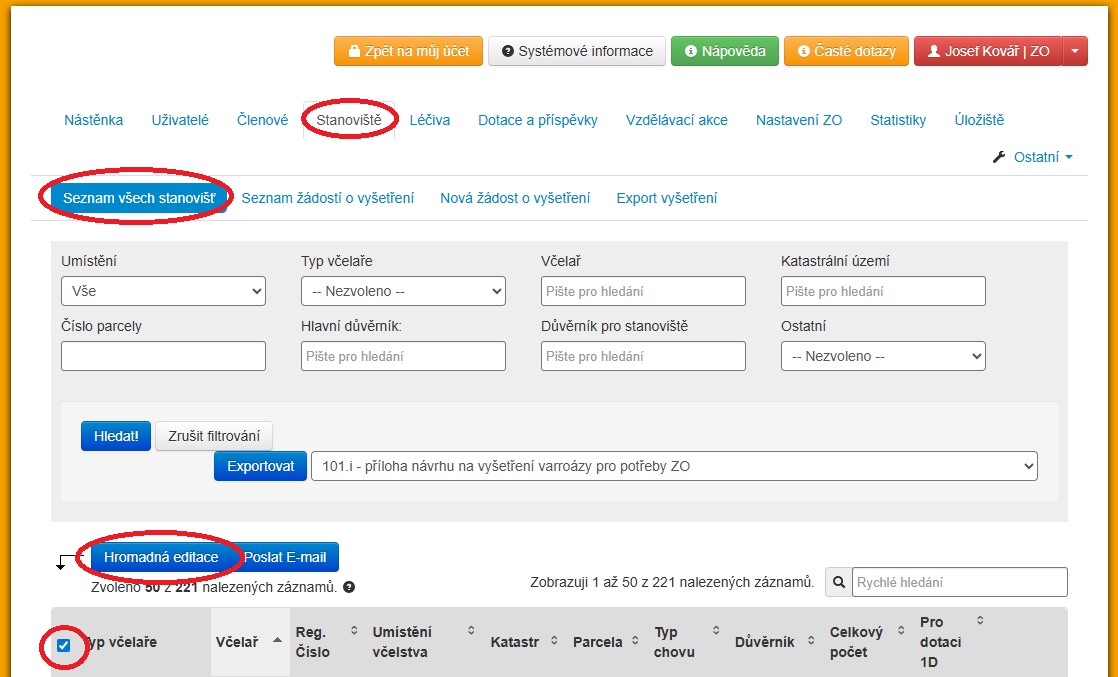 V záložce "Stanoviště" vybereme možnost "Seznam všech stanovišť", otevře se nám seznam, v levém rohu nahoře zatrhneme čtvereček, kterým označíme výběr všech včelařů na seznamu a použijeme volbu "Hromadná editace". Pod seznamem můžeme také zvolit počet zobrazených včelařů na seznamu na jednu stránku, nebo postupně vybírat po jednotlivých stranách seznamu(1,2,3).