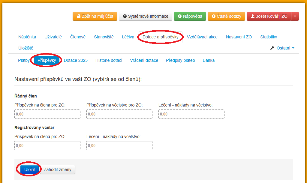 Nejprve zadáme výši příspěvků, které vybírá naše ZO na včelaře, včelstvo a léčení u kategorie Řádný člen, pak Registrovaný člen.