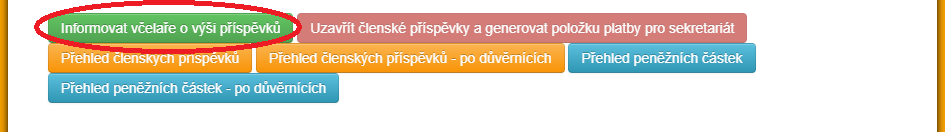Teprve po informování včelařů na zeleném tlačítku "Informovat včelaře o výši příspěvků" se vám zpřístupní volba na červeném tlačítku "Uzavřít členské příspěvky a generovat položku platby pro sekretariát".