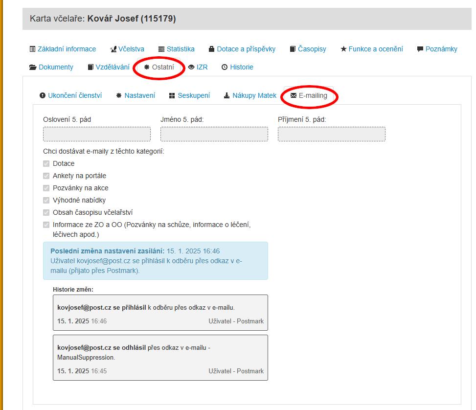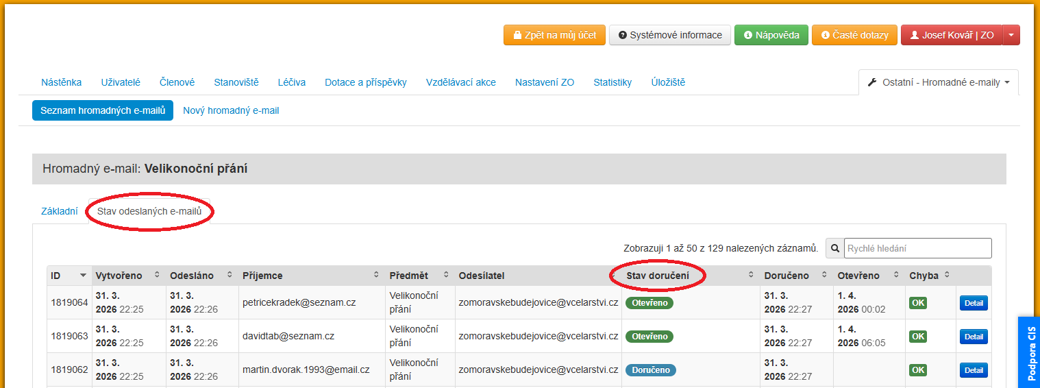 Více informací k doručování e-mailů naleznete v CIS na Kartě včelaře v záložce "Ostatní" na další záložce "E-mailing".