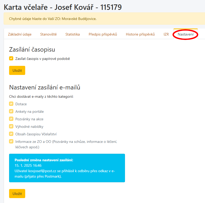 Včelař si mohl změnit zasílání e-mailů na svém Portále včelaře.