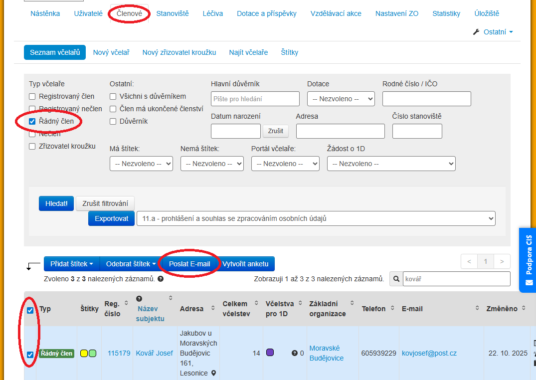 Pro vytvoření hromadného e-mailu si otevřeme záložku Členové, otevře se nám na Seznamu členů. Do globálního vyhledávání si můžeme zadat potřebná kriteria a vyhledat včelaře, kteří jim odpovídají. Z nich ještě můžeme vybírat zatržením ve čtverečku vlevo uplně na začátku tabulky a to buď výběrem všech a nebo jednotlivě zatržením pouze těch včelařů, které chceme vybrat.