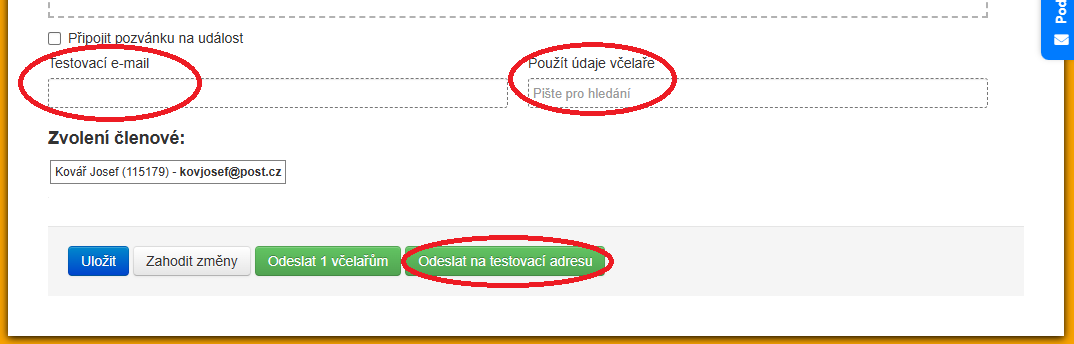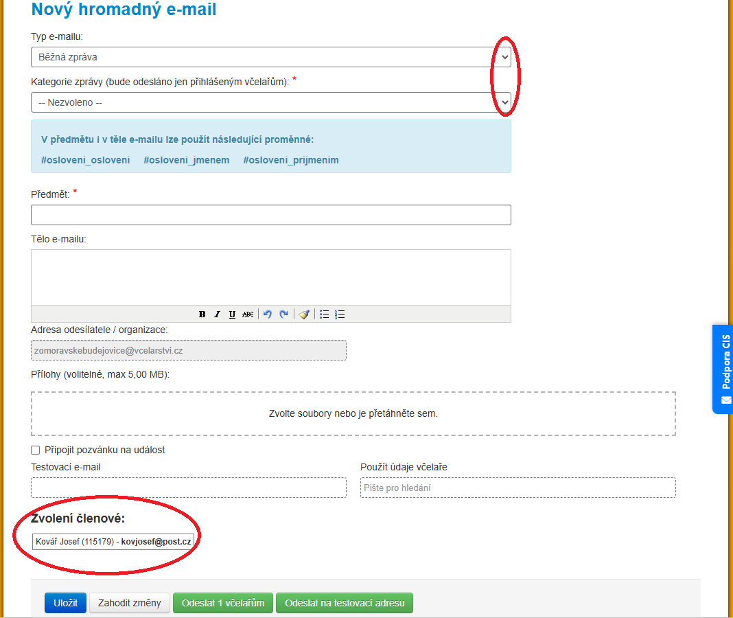 Pokud zvolíme "Běžná zpráva" vyplníme všechna potřebná pole a můžeme si zaslat testovací e-mail zeleným tlačítkem Odeslat testovací e-mail na zadanou adresu a zkontrolovat zda je vše v pořádku a poté ho odeslat všem zvoleným včelařům pomocí zeleného tlačítka Odeslat zvoleným včelařům.