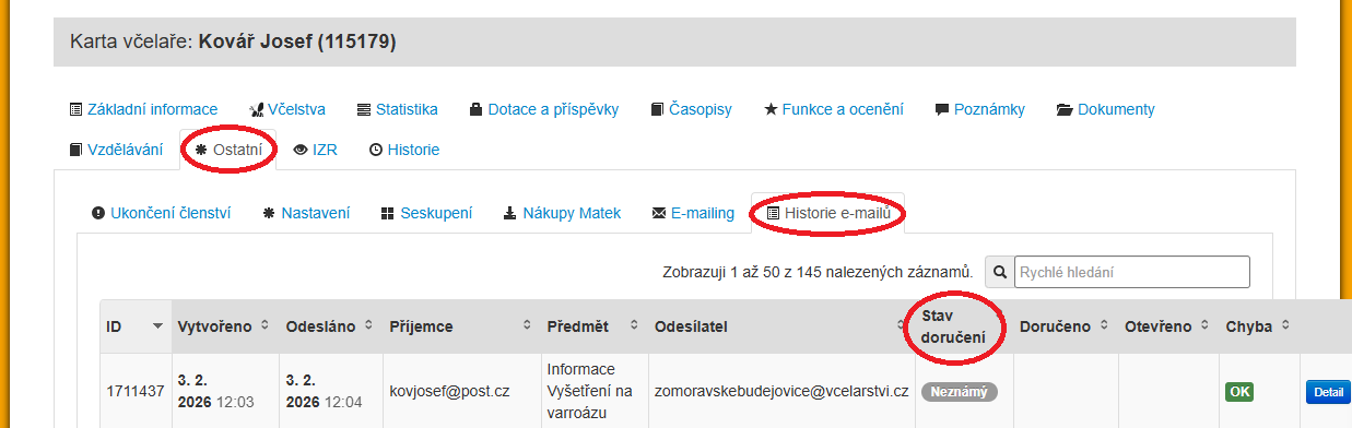 Stav doručení e-mailů u jednoho včelaře si můžeme zkontrolovat na jeho "Kartě včelaře" na záložce "Ostatní" - "Historie e-mailů".
