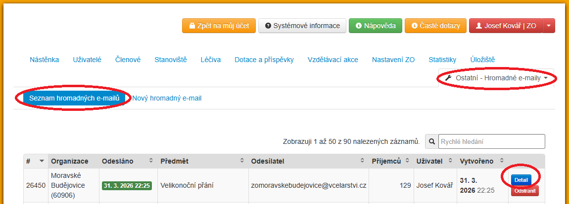 Po odeslání hromadného e-mailu si můžete zkontrolovat jeho doručení členům Vaší ZO. Na volbě "Ostatní" si vyberete "Hromadné e-maily". Tím se dostanete na "Seznam Hromadných e-mailů". Tlačítkem "Detail" si otevřete odeslaný e-mail.