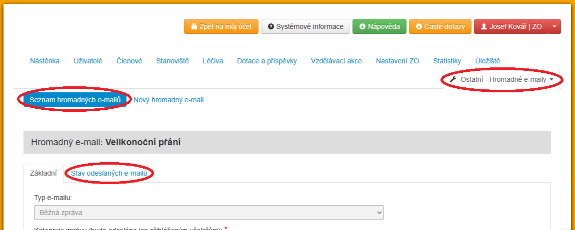 Otevře se nám okno "Nový hromadný e-mail", kde můžeme zvolit typ zprávy. Pak zvolíte "Kategorii" zprávy, např. "Dotace" a všem kteří si označili, že tyto zprávy dostávají půjde e-mail odeslat. Dole na stránce se vám zobrazí Zvolení členové a jejich e-maily a také členové, kteří námi vytvořený typ e-mailu neodebírají.
