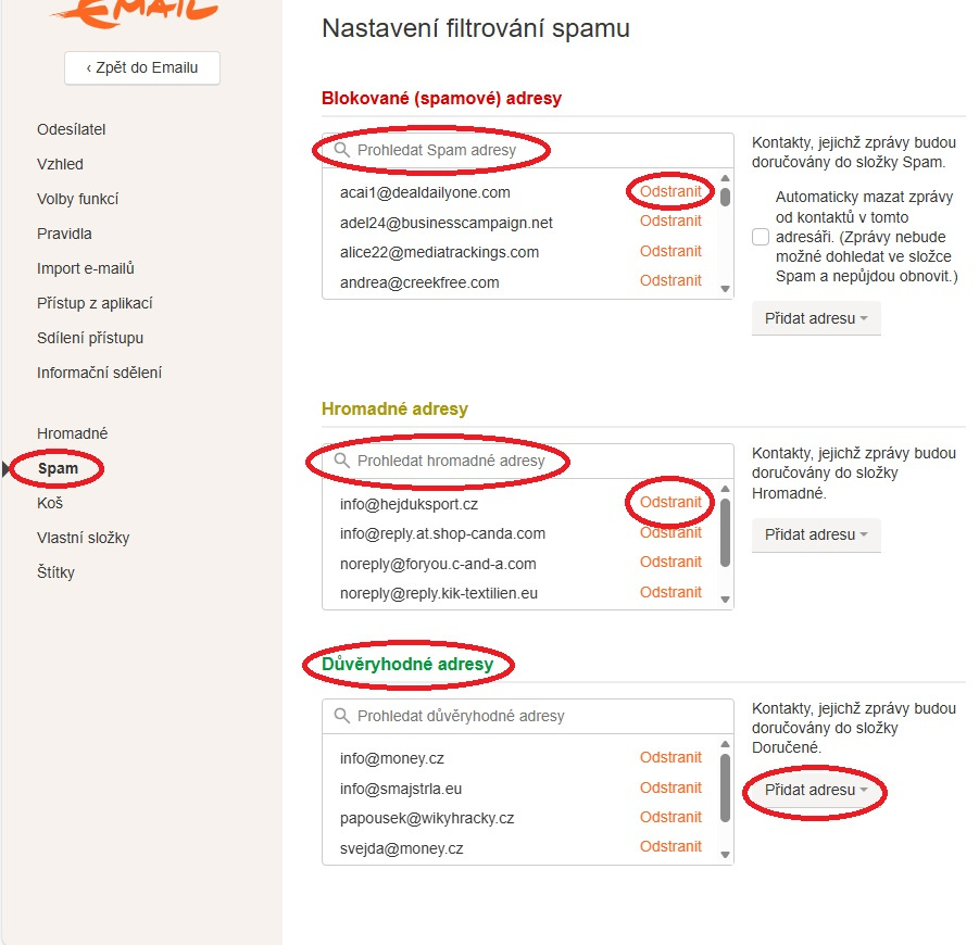 Na stránce Nastavení prohledáte Blokované (spamové) adresy, hromadné adresy. Pokud v nich naleznete adresu vaší ZO tak ji odsud odstraníte. Pak ji uložíte do důvěryhodných adres tlačítkem Přidat adresu.
